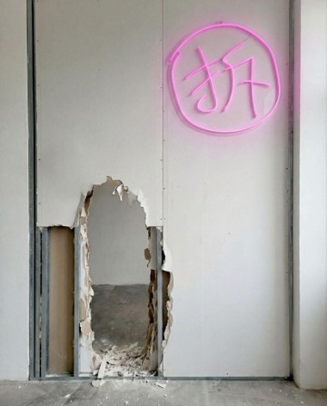 The doorway itself is boarded up with a rough opening carved through it. Above it is a neonsign reading Chāi, meaning “to demolish.” In Chinese cities, this character marks buildings scheduled for demolition as part of redevelopment.