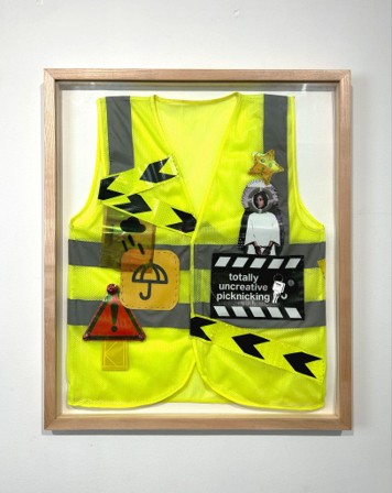 Elsewhere in the exhibition, safety vests are embroidered with strange protest slogans. Some of the phrases were generated using an early language model trained on centuries of English insults, producing surreal expressions like “Totally Uncreative Picnicking.” This reflects how language evolves under conditions of censorship, mutating into strange and unexpected forms.
