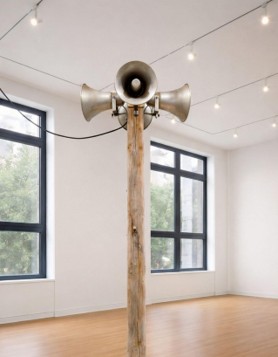 Many elements of the exhibition address networks and digital systems. Mobile-phone-like screens display game environments where the character appears in imagined scenarios. An augmented-reality sculpture of a street-cleaning trolley can be viewed through a smartphone. The work is titled May 35th, referencing creative online strategies used to avoid censorship around the Tiananmen anniversary.