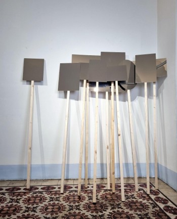 In the gallery, polished stainless-steel protest placards reflect the viewer’s face, placing them inside the protest image. This blurs the line between participation and observation.