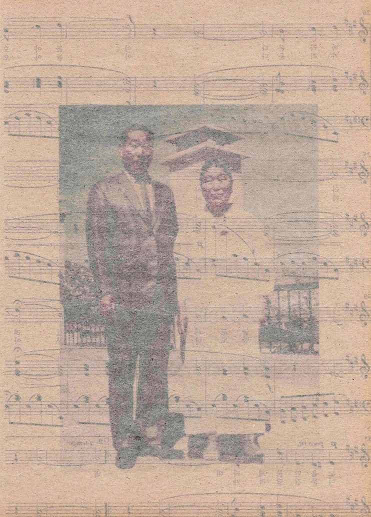 I wove these images of funeral wreaths into a video, accompanied by a song titled "Geurium," which translates to a deep yearning or nostalgia. This recording from the 1980s features my father singing, accompanied by my sister on the piano. My father was a gifted singer as a child and dreamed of becoming a vocalist, but he had to abandon that dream to fulfill his role in society. And here again, my sister remains in the background, playing the role of the unseen supporter.