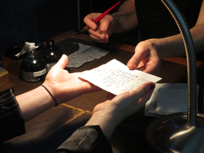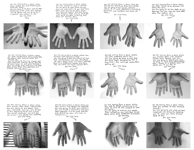 I’ve done Fortune in the context of my own exhibitions and in many different places, sometimes art spaces and sometimes not. The one time I did it through photographs was for a public art project in Lebanon, working with a group called Temporary Art Platform. Each artist collaborated with a different newspaper. For my project, I placed an ad in the paper one week that said, “Send me your hands and I’ll write your fortune.” People sent images of their hands, and I wrote their fortunes anonymously. Everything remains anonymous, because I don’t speak and I don’t look. The following week, they printed the work as a double-page spread in the newspaper, so readers could find their own hands and find their fortune.